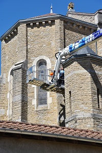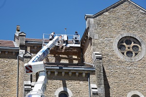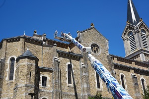 9 juillet 2020Expertise de la toiture au moyen d’un camion nacelle dont la plateforme peut s’élever à 65 mètres de hauteur.